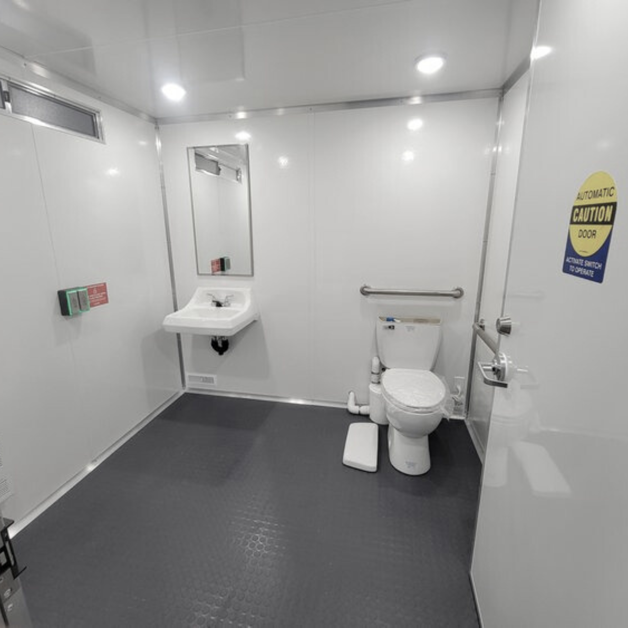- Intérieur spacieux avec toilette adaptée, lavabo ergonomique et barres d’appui sécurisées.